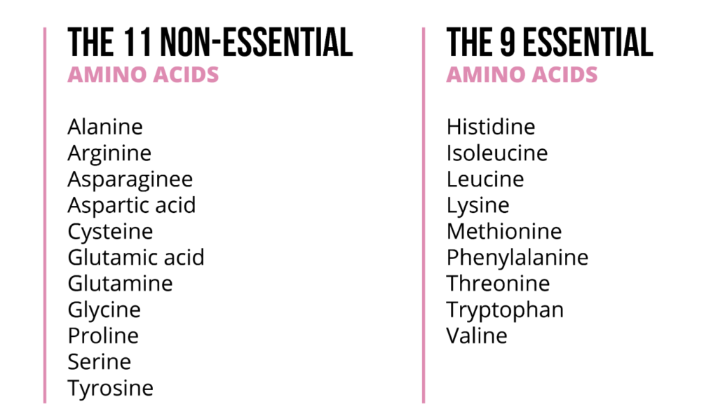 Protein, as we eat it, is made up of 20 different building blocks, amino acids. Some of these our body can produce, some of these our body can’t produce. The ones we can’t produce we call essential amino acids.
